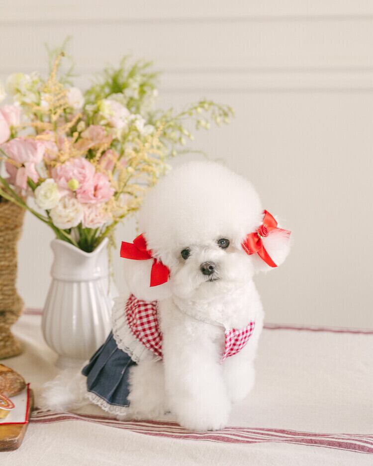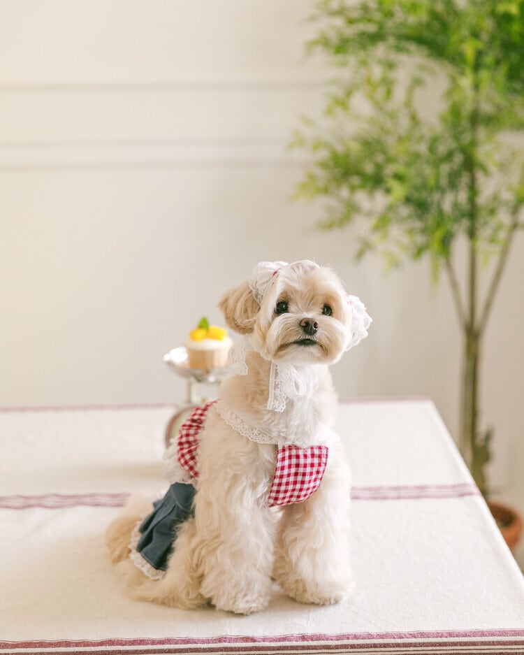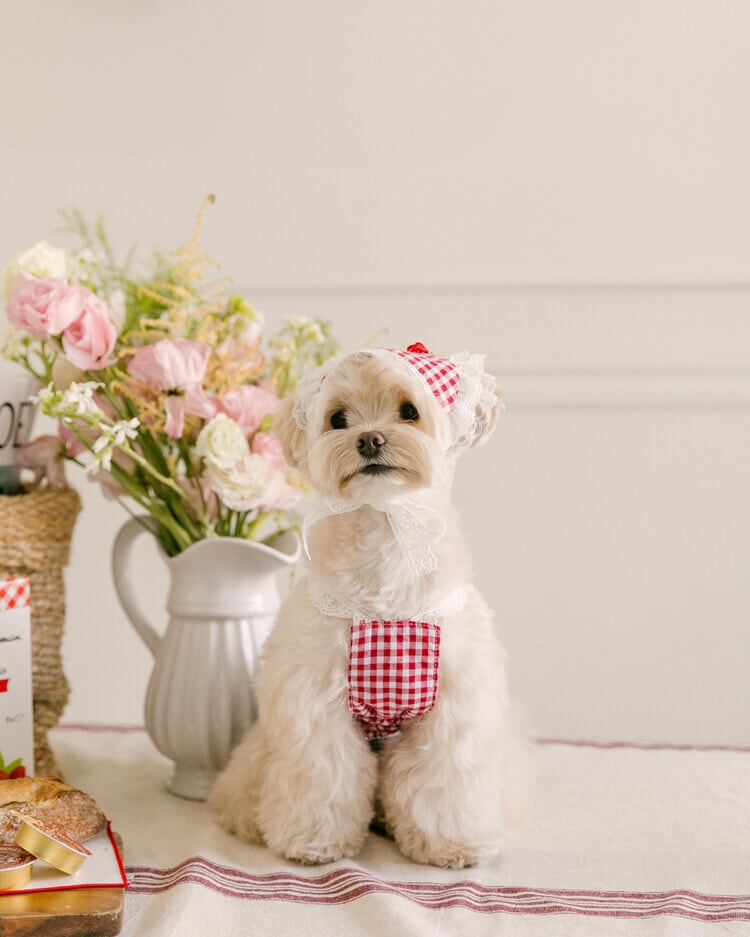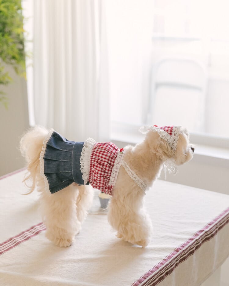 レッドギンガムチェック生地の上に、繊細なレースと小さなローズ装飾を加え、