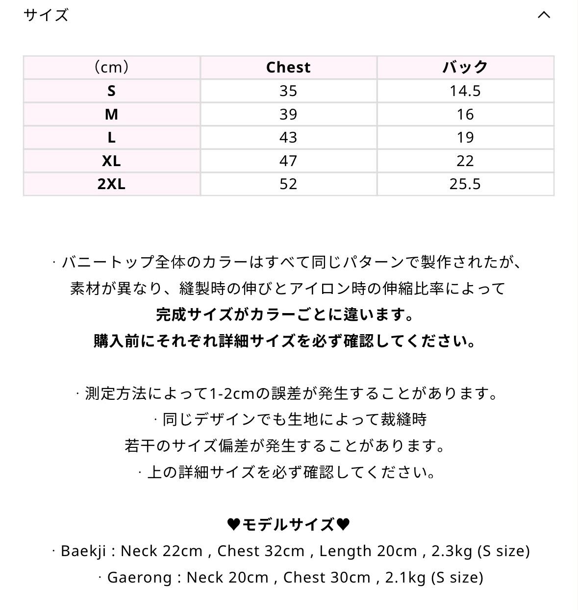 バニートップは色ごとに生地が異なるため、伸縮性などに差があり、サイズが変わりますのでよくご確認ください。