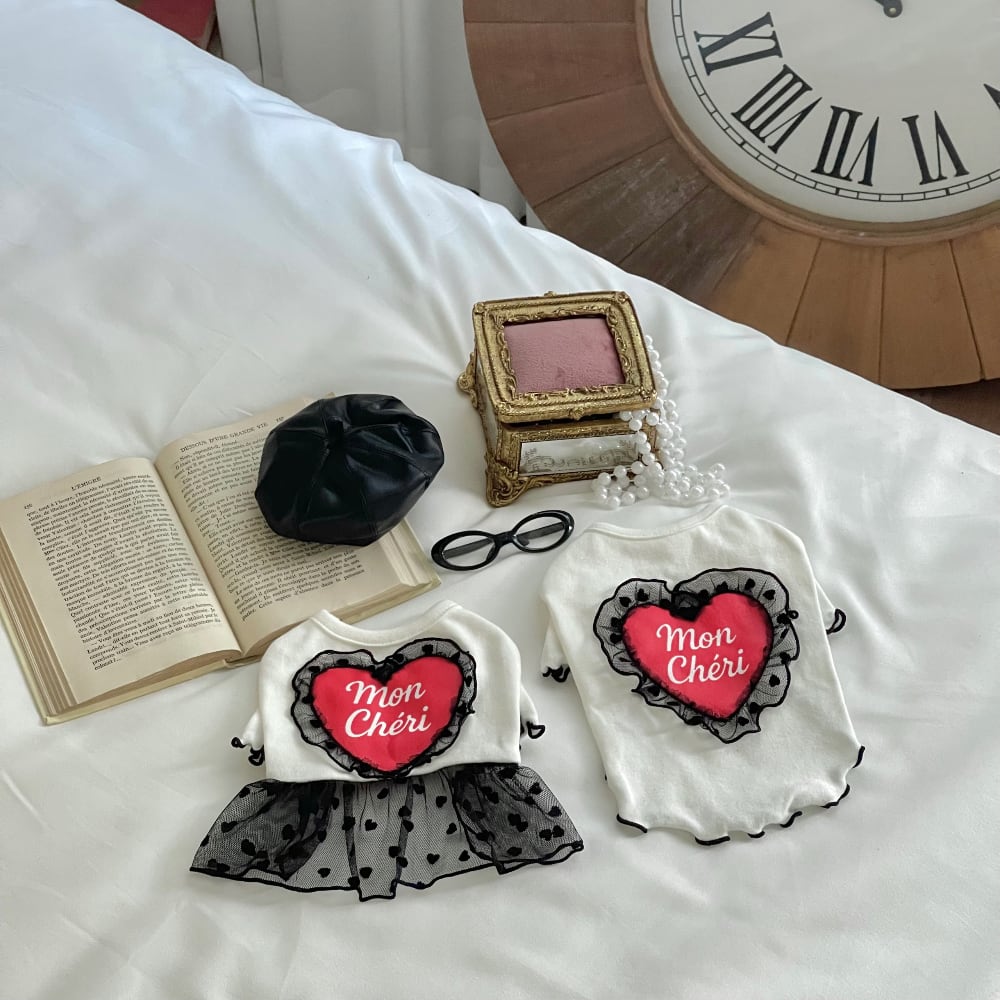 伸縮性の良いクリームカラーのコットン素材のに、レッドカラーハートプリンティングと繊細なハートシースルーレースフリルディテールで優雅で高級なルックを演出します✨