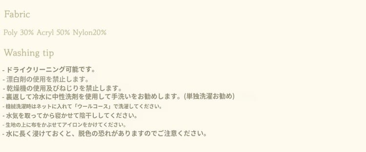洗濯機を使用する場合はネットに入れてウールコースで洗濯し、日陰で乾燥させてください。