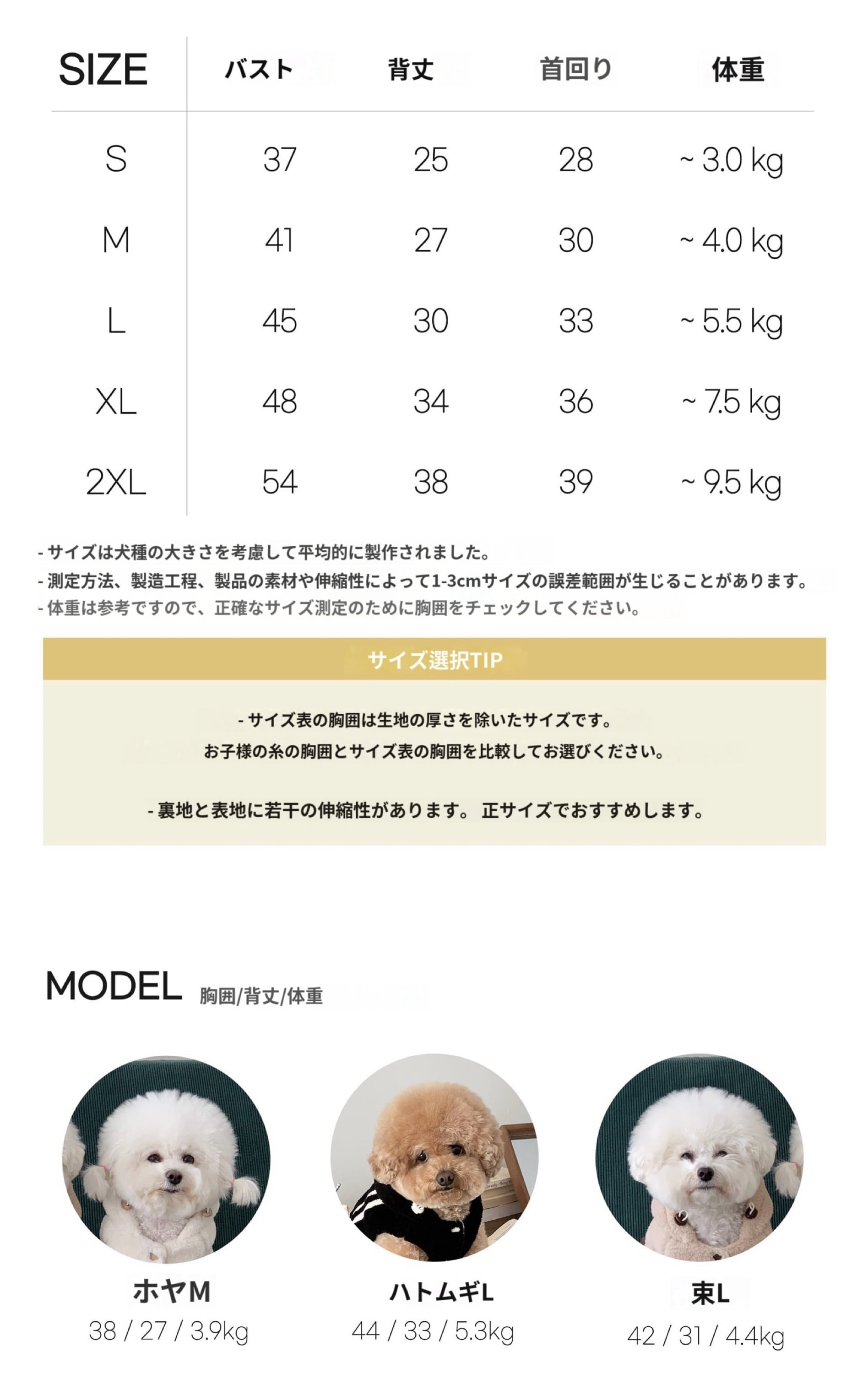 M 胸囲41cm 背丈27cm 首周り30cm 体重~4.0kg