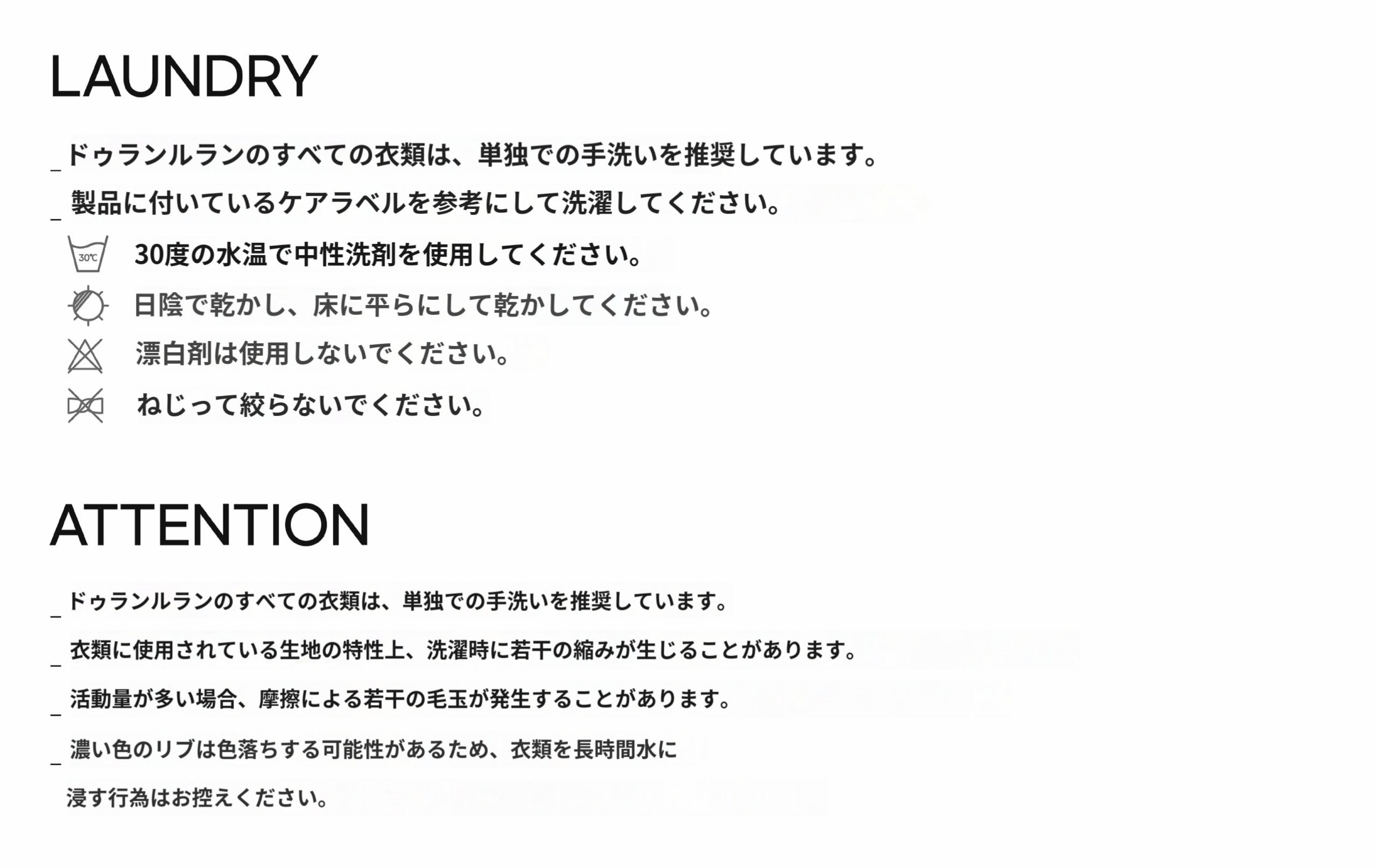 製品の付着しているケアラベルを参考にして洗濯してください。30度のぬるま湯に中性洗剤を溶かして使用してください。日陰に乾燥、床に寝かせて乾燥してください。漂白剤を使わないでください。ひねって絞らないでください。