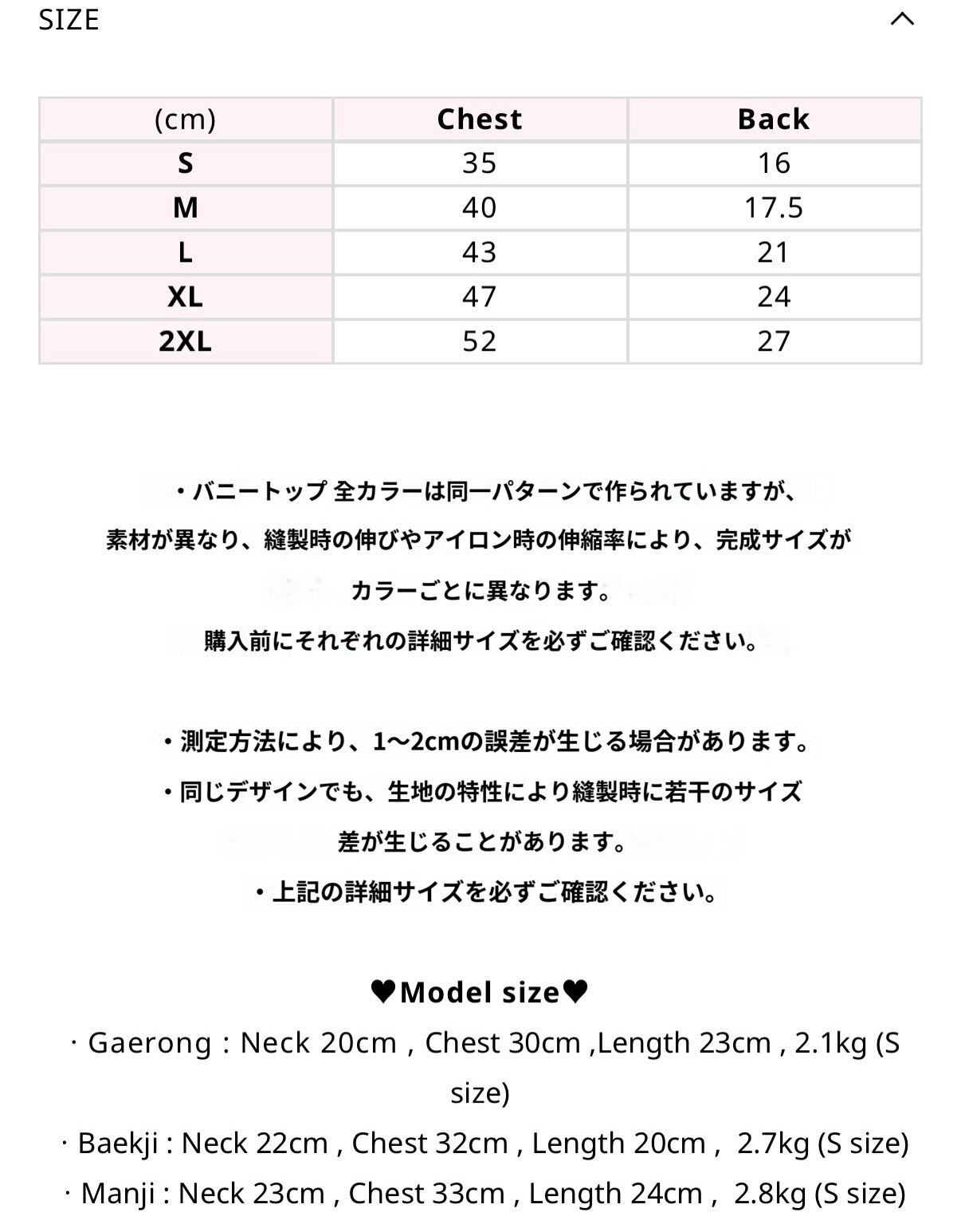 バニートップは色ごとに生地が異なるため、伸縮性などに差があり、サイズが変わりますのでよくご確認ください。